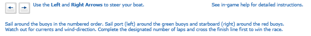Use the Left and Right Arrows or A and D to steer your boat. Sail around the buoys in the numbered order. Sail port (left) around the green buoys and starboard (right) around the red buoys. Complete the designated number of laps and cross the finish line first to win the race.