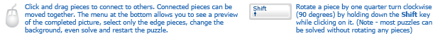 Click and drag pieces to connect to others. Connected pieces can be moved together. The menu at the bottom allows you to see a preview of the completed picture, select only the edge pieces, change the background, even solve and restart the puzzle. Select the in-game "Help" menu for more.