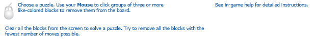 Choose a puzzle then use your mouse to click three or more like-colored blocks to remove them from the board. Try to remove all the blocks with the fewest number of moves possible. See in-game help for detailed instructions.